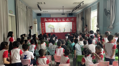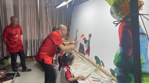 活动现场《大灰狼与小兔子》《鹤与青蛙》等经典皮影戏剧目轮番上场。活灵活现的皮影形象、引人入胜的故事情节和独具特色的唱腔,深深吸引了在场每一个孩子的目光。演出过程中,艺术家们还与孩子们进行了亲切互动,孩子们近距离接触和操作皮影道具,体验光影交错间非遗艺术的独特魅力。