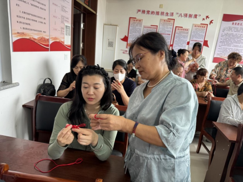 活动特邀非遗绳结传承人颜伟齐向群众讲解绳结历史文化与吉祥寓意,传授“平结”编法。居民认真学习、互帮互助,红绳在指尖穿梭,最终制成精美挂饰。